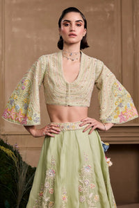 This mint green Chanderi bolero jacket features contrast cordwork and beadwork, creating a striking design with a perfect blend of elegance and texture. The soft mint green fabric serves as a delicate backdrop, while the intricate cord detailing and shimmering beads add depth and sophistication.