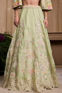 This mint green silk organza lehenga is a stunning blend of delicate threadwork and intricate beadwork, creating a luxurious and sophisticated design. The soft, airy texture of the silk organza allows for a graceful drape, while the detailed embroidery adds depth and a subtle sparkle.