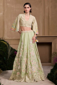 This exquisite mint green ensemble features a Chanderi bolero jacket with contrast cordwork and beadwork, paired with a matching silk organza lehenga. The bolero jacket showcases intricate cord and bead detailing, adding texture and modern elegance to the look. The lehenga, crafted from soft silk organza, is adorned with delicate threadwork and beadwork, creating a timeless and ethereal design.