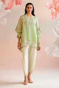 Introducing our elegant mint green silk organza tunic, featuring beautiful contrast threadwork and intricate beadwork that adds a touch of sophistication. This stunning tunic is perfectly paired with ivory Chanderi tulip pants, adorned with delicate floral embroidery for a harmonious look. Ideal for festive occasions or special gatherings, this ensemble combines modern elegance with traditional charm.
