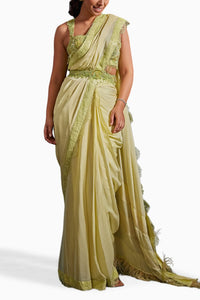 Featuring Mint Green Mridula Embellished Saree in Viscous Crinkle Chiffon. Hand Embellished in Mint Green hues. Saree is crafted in organza with ruffles. Paired with a complementing embroidered blouse. Styled with a belt.