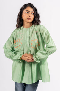 Composition: Chanderi Color: Mint Fit : True to Size Embroidery: Machine Embroidered Patch Product Code: SVEURAI-AW25-TS07
