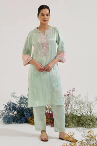 Mint Lotus Applique Tissue Kurta with Narrow Pants is a sophisticated and contemporary ensemble that blends luxurious fabric textures with intricate detailing. Adorned with delicate Machine embroidery and sequins, this outfit offers a graceful yet festive look, perfect for weddings, receptions, or celebratory occasions.
