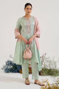 Elegant and festive, the Mint Lotus Tissue Kurta Set features delicate applique, embroidery, and sequins on luxurious fabric, paired with straight-leg pants. Complete the look with the Chanderi Stripe Dupatta, adorned with zari lotus motifs and a tissue panel—blending traditional charm with refined, modern sophistication.