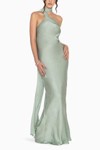 Featuring Sacre Gown by Contemponari. This stunning asymmetrical Modal Satin gown redefines elegance with a touch of avant-garde flair. It features a halter neckline and a stylish scarf extension that adds an additional layer of glamour to the ensemble. The scarf extension, draped artfully, not only adds a touch of drama but also offers versatile styling options. Ideal for upscale events and sophisticated soir , this mint gown promises to make a statement with its unique design and luxurious appeal.