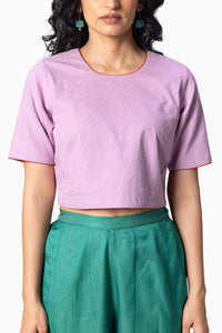 Mira Blouse, this softly tailored blouse is adorned with red voile piping and features a circular neckline with a back slit, and half sleeves with a quilted texture.