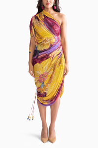 Featuring Mira Yellow Dress by Saaksha & Kinni from Botanica Collection. A daisy print dual-tone one-shoulder dress with hand micro pleats, adorning adjustable drawstring sleeves and length for a customizable, elegant fit.