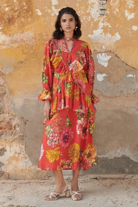 Tiered maxi dress featuring drop waist, soft ruffles, v-neck with mandarian collar, side inseam pockets, statement drawstring sleeves and side zip closure. The bodice of the dress is adorned with delicate hand embroidery.