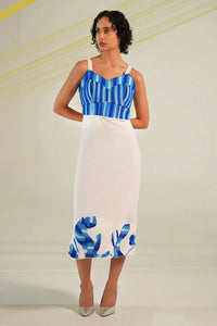 Featuring a white dress with a bodice detailed in ombré blue PVC cord, this piece is finished with an embroidered contrast panel at the hem. Slim shoulder straps and a side zipper closure add to its clean, streamlined silhouette.
