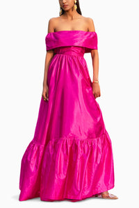 Featuring Mirage Fuchsia Pink Dress by Malie. An off shoulder dress with overlay detail and back closure. It sits nicely at bust and falls loosely over the hip. It has a statement frill at bottom and is full length.