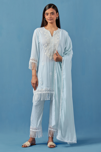 Featuring miral aqua kurta & Palazzos with crochet appliqué lace detailing, paired with a dupatta with lace edging.