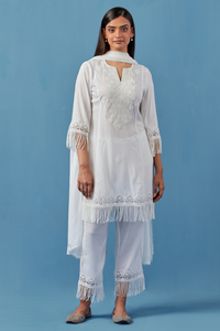 Featuring miral white kurta & Palazzos with crochet appliqué lace detailing, paired with a dupatta with lace edging.