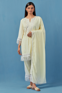 Featuring miral yellow kurta & Palazzos with crochet appliqué lace detailing, paired with a dupatta with lace edging.