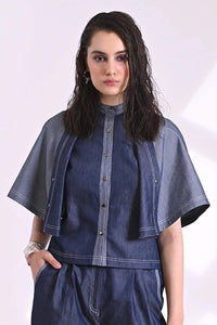 Elevate your denim game with this statement cape-sleeve jacket. Designed with a mix of light and dark washes, it features a structured fit, front zipper closure, and flowy, oversized sleeves for a bold yet refined look. Perfect for layering over fitted tops or dresses for an effortlessly chic edge.