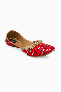 Featuring Mirror Love Red Juttis by 5 Elements by Radhika Gupta. A perfect pair of red handcrafted juttis comes with all-over Mirror with embellishment of silver ghungroos.