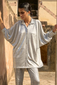 Oversized boxy shirt in a shimmering drapey silver knit fabric, Hand applied mirror embroidery on the collar and cuff. Curved shirt hem in the front, square hem in the back. Dolman sleeve, relaxed fit. Silver snap button closure down the front.