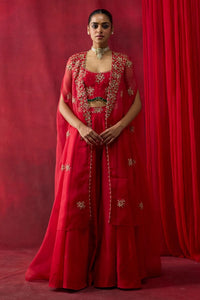 Featuring a red silk organza cape, exquisitely detailed with thread and hand embroidery. Paired with a matching silk Chanderi blouse, also embroidered, and styled with elegant silk Chanderi sharara pants, this ensemble radiates festive sophistication and artisanal charm.