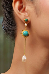 If your personal style resonates with bold, playful and offbeat or you want to get a bit experimental with your travel style, then this stunning pair of 22kt gold plated mismatched earrings is just your vibe. These earrings do not follow the traditional symmetric pattern, where both pieces of the pair are the same. It’s a great way to have fun with your jewellery and make an eclectic statement.One earring is studded with Malachite and Turquoise in prominence. The other one is set with Malachite and Garnet in prominence. The baroque pearl drops bring in some cohesiveness.