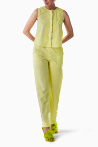 Featuring the Miss Samara Co-ord Set from House of Zeniaa's Mamma Mia Collection, this ensemble includes a sleeveless lemon yellow top adorned with pearl buttons, paired with straight pants in the same hue. Perfect for various occasions, this offers a stylish and sophisticated look that's cohesive and chic.