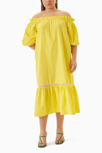 A bestseller, our yellow off shoulder dress in 100% cotton poplin with lace at the hem and sleeves. Team it up with a belt or a necklace to add that jazz.