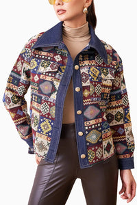 This front-open multi-hued jacquard and denim jacket effortlessly blends rich textures and vibrant colors, Perfect for embracing boho elegance with a touch of warmth.