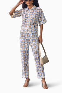 This elegant lace co-ord set features a charming collar and flattering half sleeves, exuding sophistication. The front button fastening adds a touch of refinement, while the coordinating slim-fit pants complete the ensemble with effortless style and grace. Perfect for making a chic statement at any occasion.