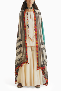Elevate your look with the Mitra Short Kurta Set. The Printed Short Kurta features tribal tassel and mother of pearl detailing on front neck paired with sharara trouser with printed dupatta. Crafted from natural crepe, offering relaxed-fit comfort.?