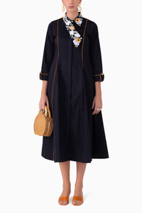 Introducing the Miyake Black Cotton Satin Embroidered Collar Dress—a stunning A-line piece that effortlessly combines elegance and style. This black dress features a striking statement appliqué and a beautifully hand-embroidered collar, adding a sophisticated touch. With convenient side pockets, a concealed placket, and contrast piping details, this fit-and-flare design flatters every figure. Perfect for both day and evening wear, this dress is a must-have for any fashion-forward wardrobe!