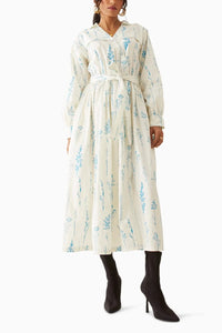 Miyoko dress with circuit and carnival print pair, a mid length dress with half sleeves with a front button closure. The pleat inserts add movement and drama to the silhouette. The dress, equipped with a detachable belt with contrast top stitches, provides styling versatility. It can be cinched at the waist for a flattering silhouette or worn without the belt for a more casual appearance. This ensemble transitions seamlessly from daytime events to evening outings.