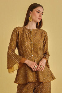 Featuring the Mocha Artisanal Bandhani Peplum Top by 29 India's Sunehri collection. Crafted in hand-tied and dyed crushed Raidana silk Bandhani by skilled Kutch artisans, this peplum top is thoughtfully designed to merge heritage craft with a contemporary silhouette.