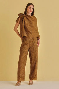 Featuring the Mocha Crushed Bandhani Pants by 29 India's Sunehri collection. Made from hand-tied and dyed crushed Raidana silk Bandhani, these pants are expertly crafted by Kutch artisans, offering a fluid silhouette with earthy elegance and timeless appeal.