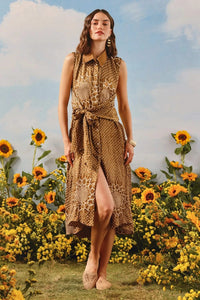 Featuring the Mocha Gajji Silk Bandhani Dress by 29 India's Sunehri collection. Handcrafted in hand-tied and dyed Gajji silk Bandhani by Kutch artisans, this backless tie-around dress is styled with refined detailing for an elegant and earthy festive look.