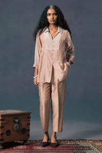 Featuring Mocha Mousse Co-ord Set by ARCVSH, this mul chanderi shirt with soft discharge print pairs seamlessly with silk chanderi straight pants, offering a warm, understated look that transitions effortlessly from relaxed daytime elegance to intimate festive occasions.