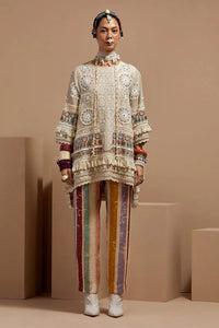Featuring the Mogra Basque Mitra Short Kurta With Multi Stripe Pants by Aseem Kapoor's Basque Collection. This stunning set includes a heavily laced and embroidered multi-colored top with resham thread, cowri shells, M.O.P. beads, and tassel details, paired with printed straight trousers featuring an elasticated waist for a relaxed, easy fit.