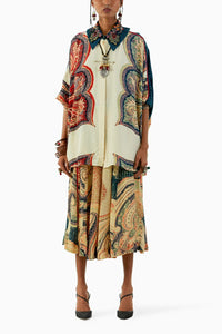 Elevate your style with the Mogra Mandala Shirt and Drape Trouser Set. The Ambi Print Mandala shirt features zari marodi embroidery, paired with relaxed-fit printed culottes trousers, all in natural crepe.