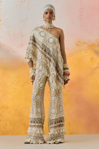 The Mogra Mural Rasa One Shoulder Top features a one-shoulder design with intricate resham thread embroidery, cowri shells, M.O.P. beads, and tassel details, complemented by a heavily laced and embroidered bootleg trouser. The easy-fit top pairs with slim-fit trousers featuring an elasticated waist, creating a stylish contrast of relaxed and slim fits for ultimate comfort.
