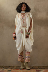Featuring the Mogra Mural Ritu Kaftan Tunic with Straight Trouser Set by Aseem Kapoor from the Mural Collection. This set includes a textured solid-colored tunic with an embroidered yoke, tribal tassel details, and seam inserts, paired with chevron-printed straight trousers. Adorned with resham thread embroidery, cowri shells, beads, and tassels, the tunic offers a free-size anti-fit, while the trousers feature an elasticated waist for a relaxed fit. *Slight variation in print may occur.*