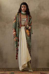 The Mogra Mural Veni Dupatta Jacket with Drape Skirt Set features a full embroidered blouse paired with a solid-colored textured skirt and an embroidered printed dupatta jacket. Adorned with resham thread embroidery, M.O.P. beads, and tassel details, this set includes a body-fitted blouse, a relaxed-fit skirt with an elasticated waistband, and a buttoned, structured anti-fit jacket, offering a stylish and comfortable combination.