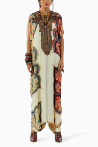 Experience grace in the Mogra Vayu Jumpsuit. The Ambi Print Jumpsuit Kaftan, adorned with embroidered dori and stone details at the neck, features an anti-fit silhouette and a metal zipper back opening. Crafted from natural crepe.