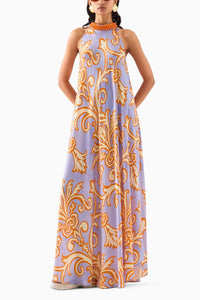 The Mojito Halter Dress crafted from our stunning vegan silk fabrication has Embroidered Stone Collar. Made in our digitally printed lilac damask print this is a trend setting piece. Featuring halter sleeves, this piece is versatile and easy to wear. It is floor length and has an easy to wear fit with a back hook. Pair it with heels for an elegant look.