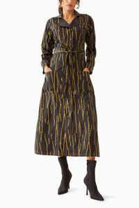 Molly dress in Rain print, a sheath fitted dress with a lapel collar, full sleeves and patch pocket details. Finished with contrast double top stitches, the dress is a refined formal evening wear