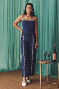 Elevate your look with this chic denim corset and pant set. The strapless corset features delicate floral beadwork along the neckline, paired perfectly with high-waisted, straight-leg pants adorned with matching floral embroidery. A modern blend of structure and elegance  ideal for statement styling.