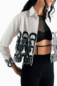 The Monochrome Knit Loop Cutwork Cropped Shirt, crafted from cotton poplin and foil-coated taffeta in black and white, features intricate knit loop cutwork detailing. This modern, cropped design combines striking textures and bold patterns, offering a chic, contemporary look with a unique edge.
