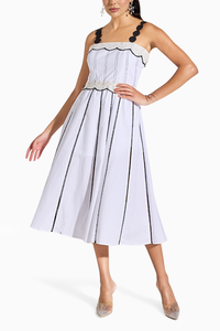 Featuring a white and black midi dress with lace highlights and laser straps.