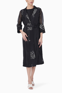 Featuring a monochrome rose print organza jacket with solid jumpsuit in silk chanderi.