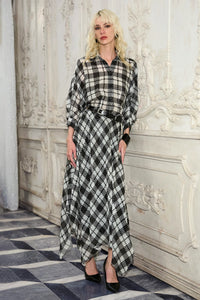 Monochrome tartan sequin shirt. Hand sewn pleats on the front and back add a flattering shape. 3/4th dolman sleeves, button down front with a shirt collar. Crafted from lightweight fabric for an airy, effortless look. Slits in the sides. Paired with matching asymmetric skirt. Midi length with a handkerchief hem and an A-line flare. Lightweight skirt with lots of movement. Fully elasticated waistband with belt loops at the waist.