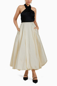 Featuring Monroe Black Top with Manhattan Cream Bottom by Malie. This co-ord set includes a halter neck top with Voluminous skirt. The top has a slightly pleated bust and a side zipper for closure. This elegant piece is crafted from satin fabric. Paired with the skirt a full, flowing silhouette and gathers at the hem, a high waist with a side zip for comfort. It has a smooth elegant drape.