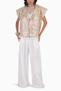 Featuring the Moon Bloom Jacket with Ivory Top and Silk Wave Pants Set, this luxurious ensemble includes a golden lurex jacket with intricate cutwork motifs, a versatile hand-embroidered net top, and flowing 100% silk pants. Perfectly blending modernity and tradition, it offers head-turning elegance for any special occasion.
