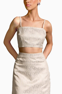 This sleek, minimalistic cropped Moonlight top features a delicate, textured fabric with thin straps, offering a refined yet modern look. The subtle shimmer adds an understated elegance to the form-fitting silhouette.