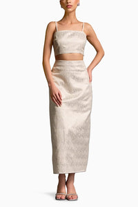 Elevate your style with the sleek Moonlight set, featuring a cropped, textured top with thin straps and a shimmering high-waisted ankle-length skirt. Together, they create a chic, minimalist silhouette perfect for modern elegance.